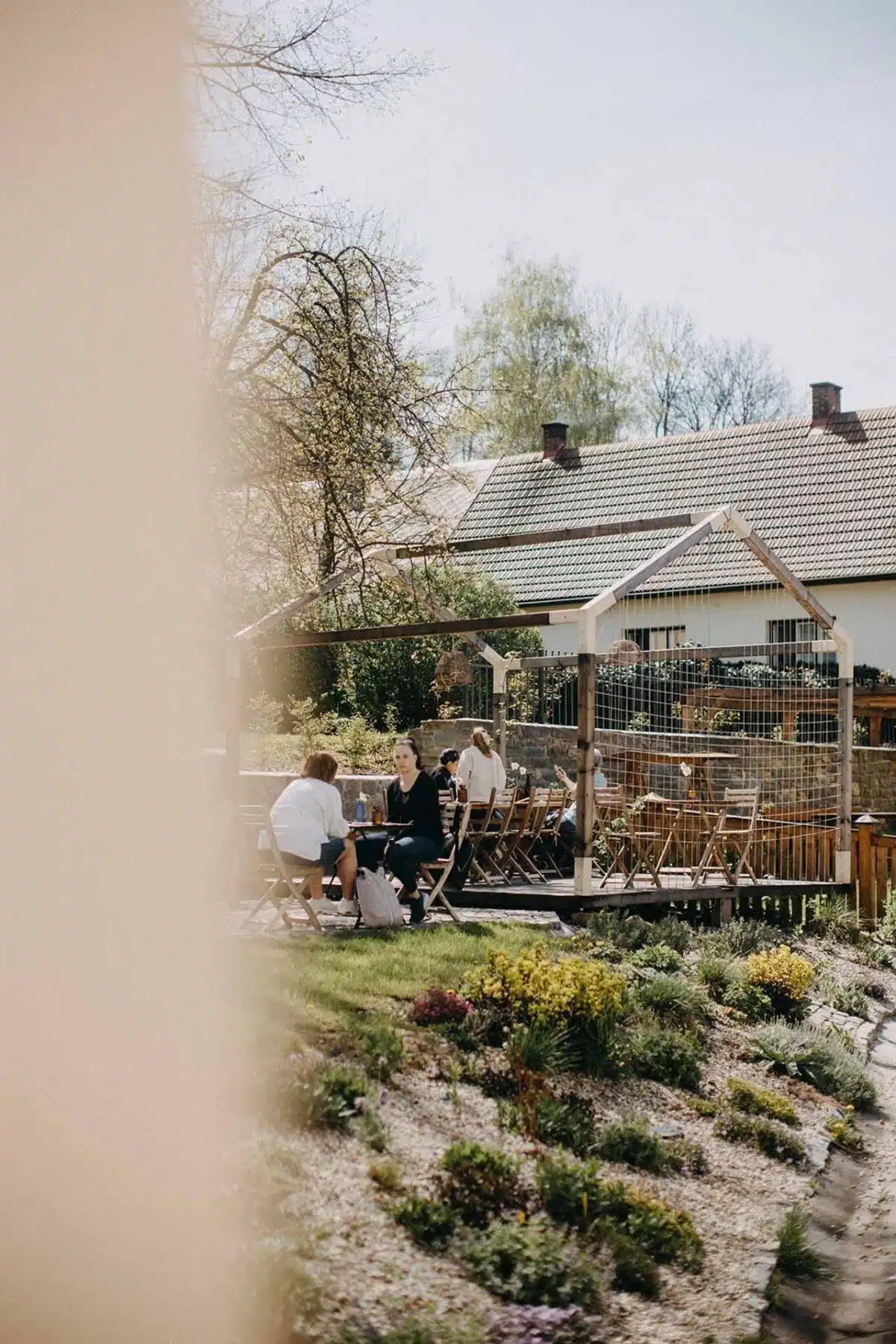 Za farou je i zahrada. Není nějak extrémně velká, ale tam je to největší rozšíření naší kavárny: více než 30 míst k sezení. V létě je to úžasné místo, plné květin, ticha, zpěvu místních ptáků a taky kávy.
