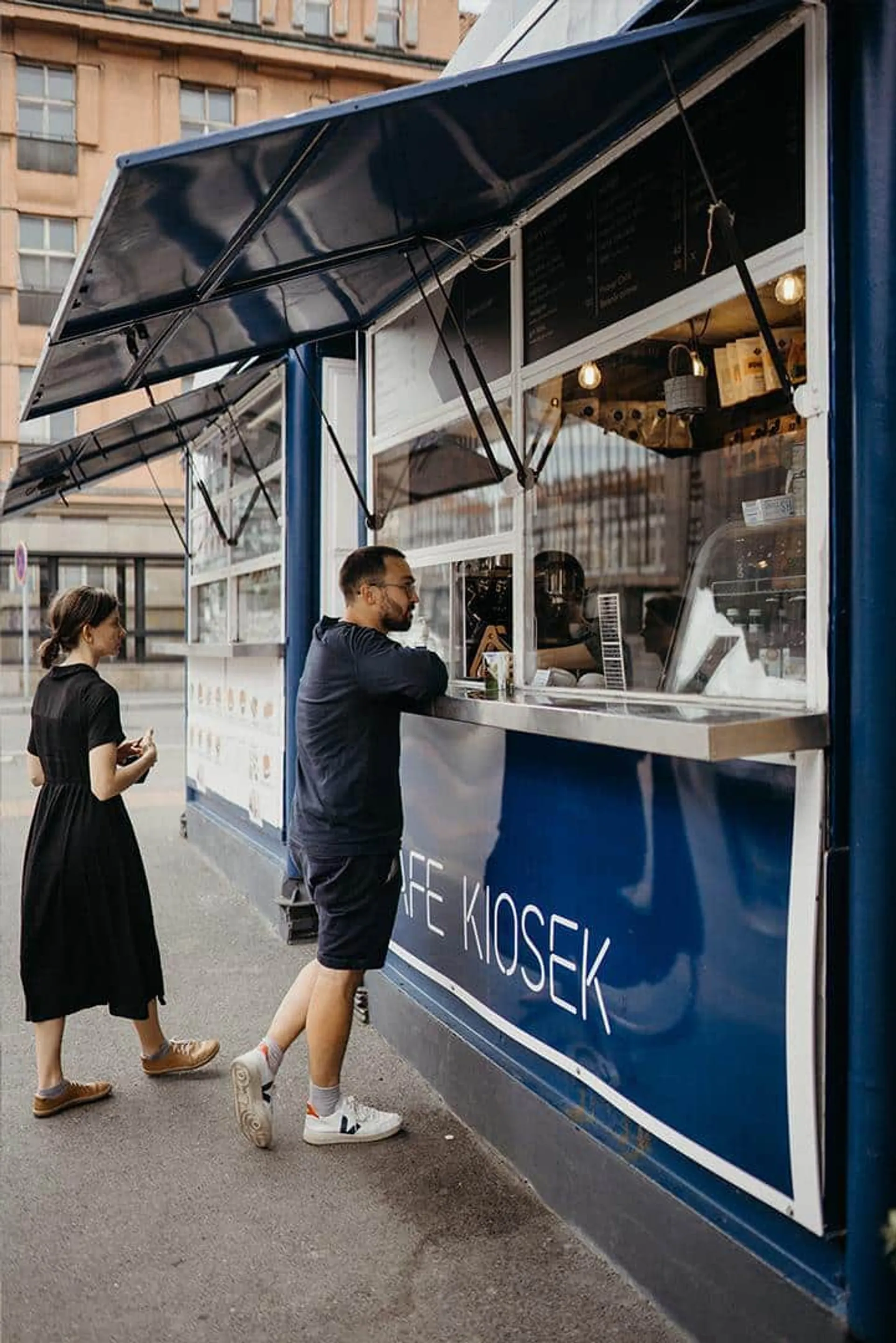 Náš Dejvický Kiosek není tak úplně tradiční kavárna, kde si v klidu sednete a vyřídíte email, ale právě ze své podstaty a díky poloze nabízí jedinečnou příležitost si ve stoje se šálkem kávy povídat s přáteli, pozorovat ruch ulice či si vzít kávu s sebou a rychle běžet na autobus nebo do školy. Unikátní je taky bezesporu naše schopnost vtěsnat na pár metrů čtverečních (Kiosek má tak 2,5m x 2,5m) docela slušné vybavení, hromadu balíčků, příslušenství a k tomu dva baristy(tky).